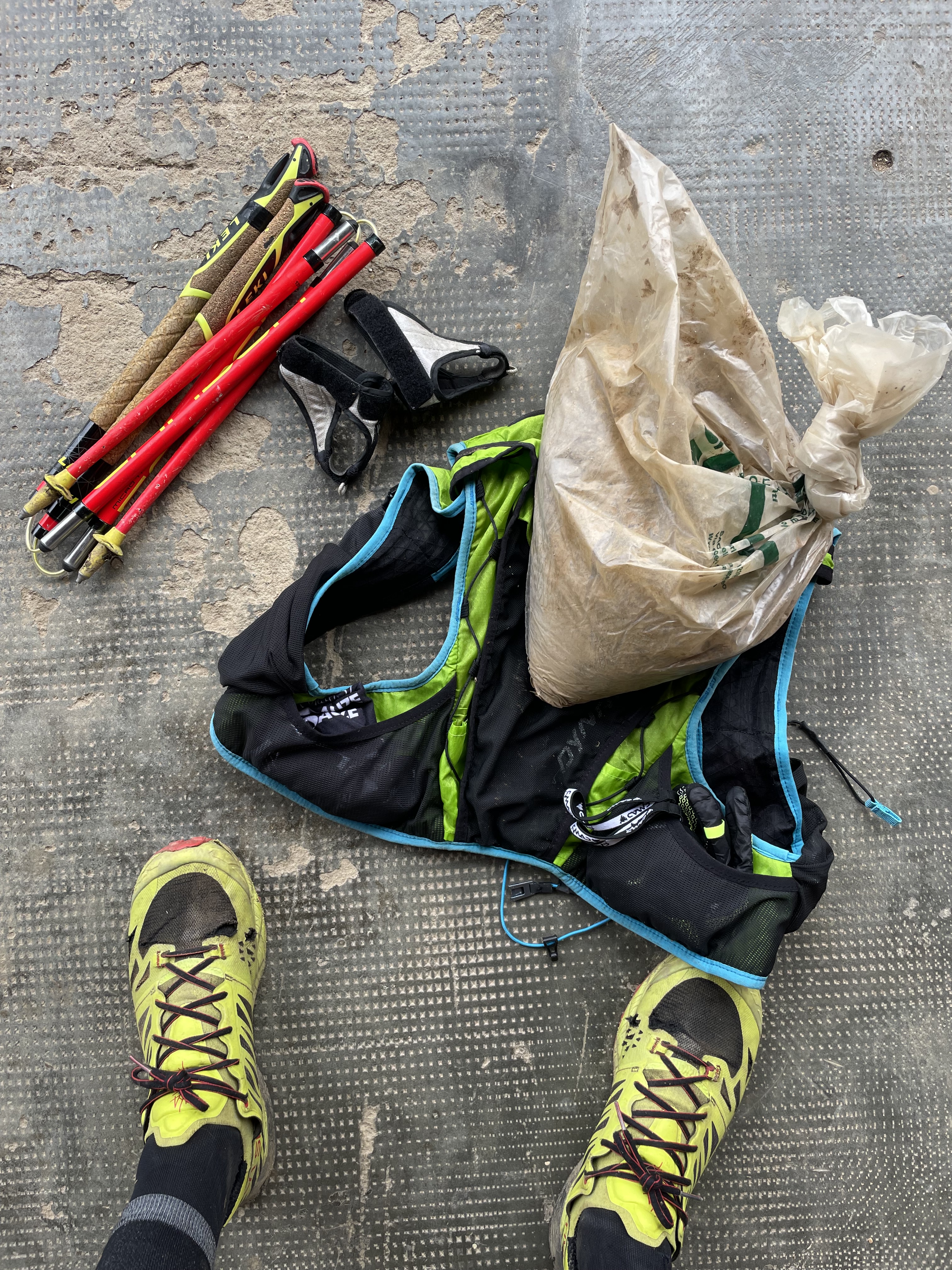 Le mie rando/trail in questo momento prevedono un sovraccarico di 5kg e l’utilizzo dei bastoncini come aiuto nei tratti ripidi in salita ma soprattutto in discesa. La zavorra è un sacco di plastica recuperato con della terra presa dall’orto. Si adatta bene alla schiena, è morbida e trattiene anche il calore negli allenamenti quando fa freddo.