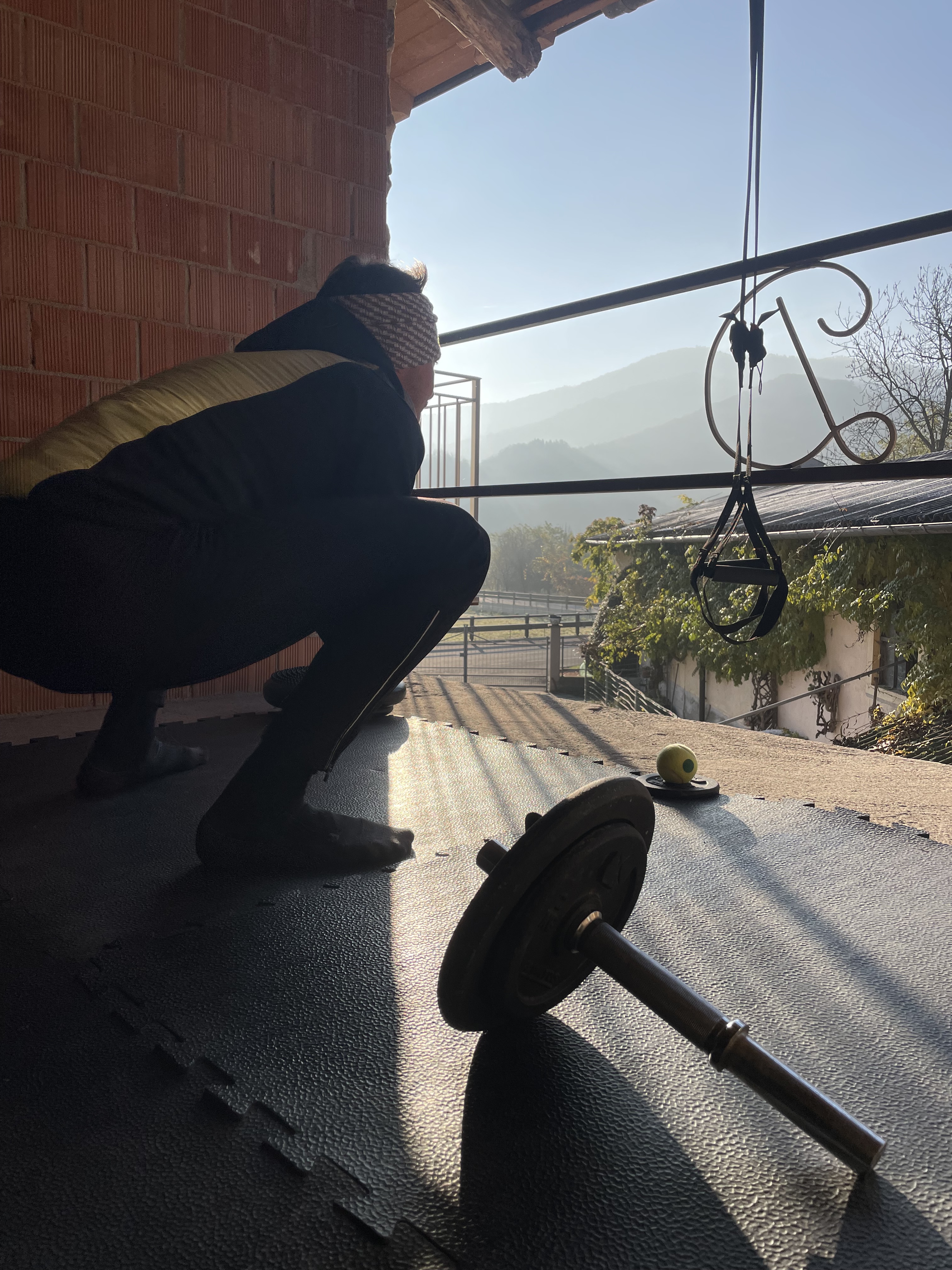 Diverse volte inizio nel buio della mattina, il lume della frontale e il vapore dei miei respiri. Tengo i guanti fino a metà allenamento, la ghisa è un blocco gelido. Mi piace così. Senza stress logistici, a contatto con l’esterno, il luogo in cui amo vivere. Il sole spunta quasi sempre verso fine allenamento, sorge forte ed infuocato, come il mio entusiasmo in questo processo.